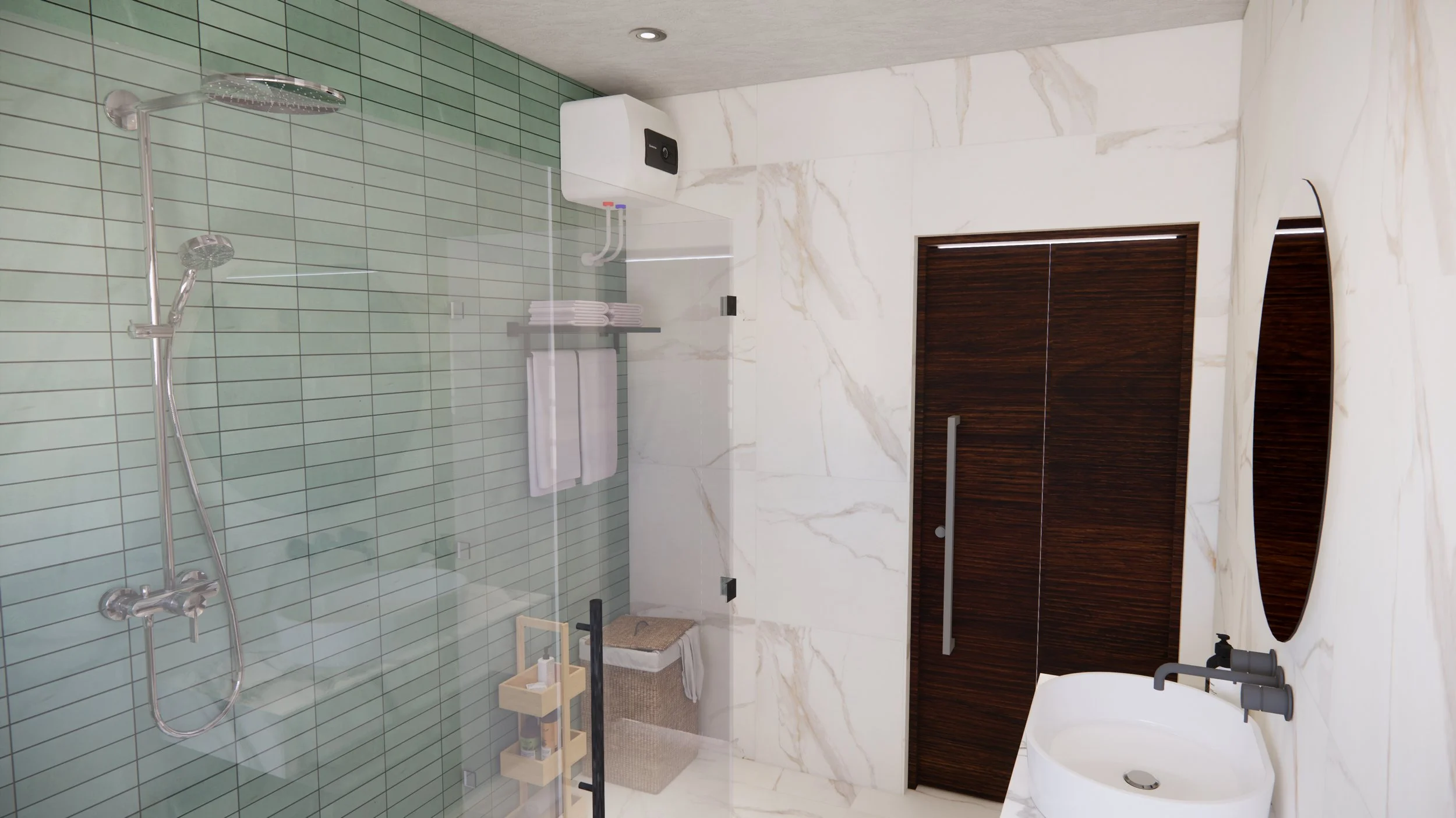 This bathroom pairs mint green wall tiles with blue-green marble accents, creating a calm and cohesive palette that feels both modern and serene. A glass shower cubicle defines the space with clean transparency, while matte black and silver fixtures introduce subtle contrast and visual structure.