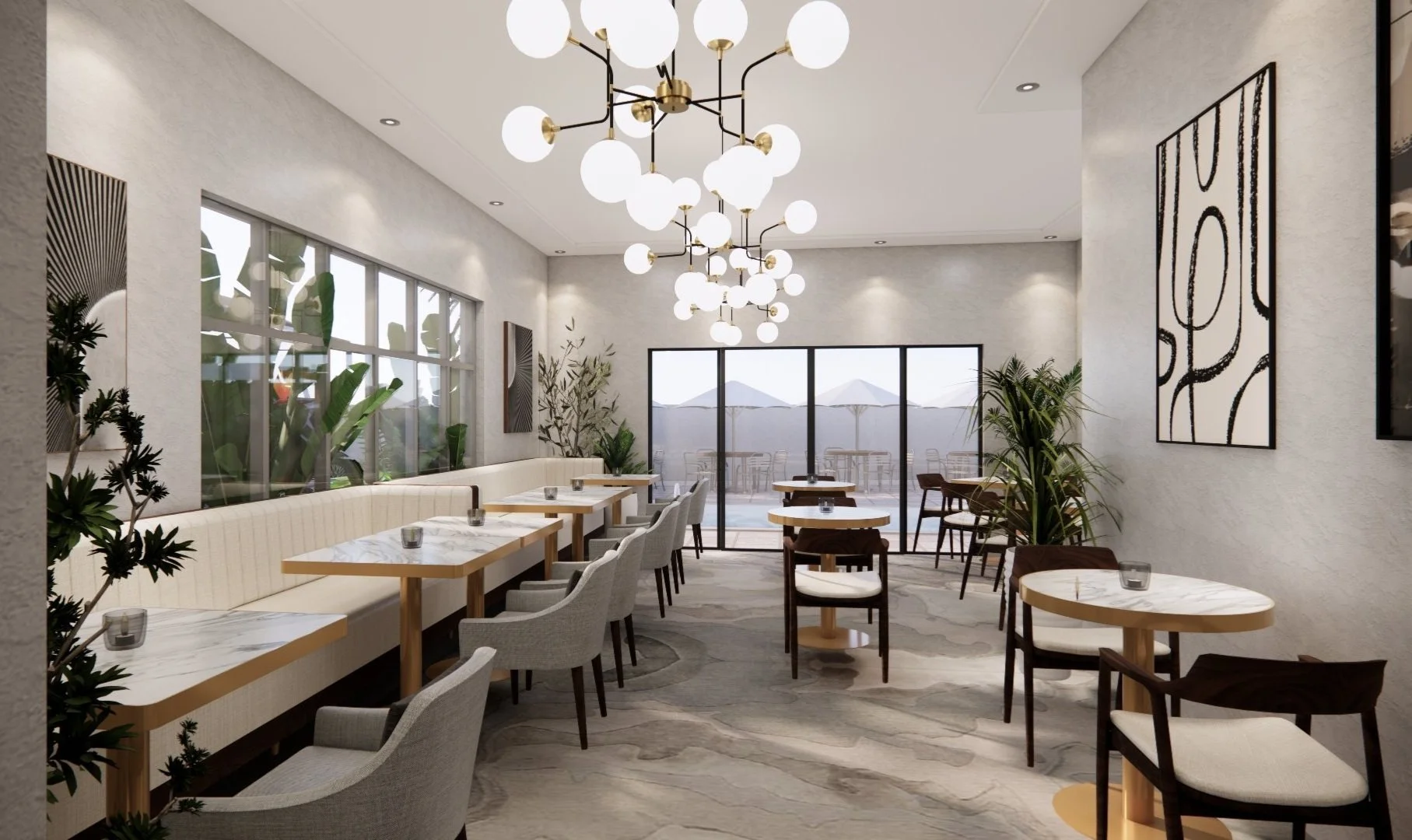 Beyond the guest experience, our design approach prioritizes seamless hotel operations. Thoughtfully planned service areas, efficient circulation routes, and strategically placed amenities enhance workflow and accessibility for staff, allowing for effortless hospitality. Features such as a formal dining space, with a view of the serene poolside and bar, upgraded reception, entrance foyer, and a state-of-the-art gym, cater to diverse guest needs, while a private meeting space creates opportunities for business and leisure alike.