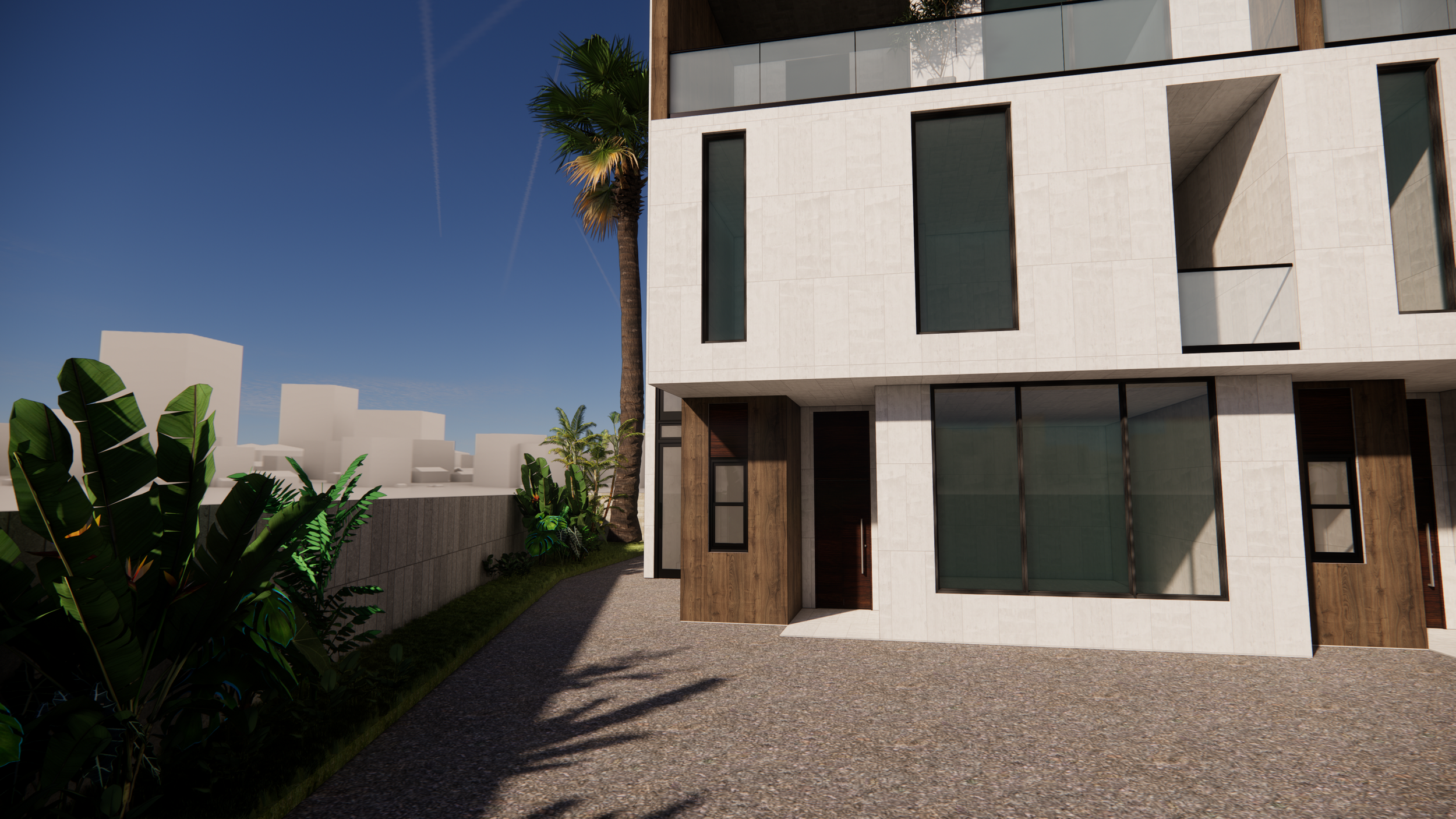 The architecture celebrates balance and proportion through clean geometric lines, generous glazing, and thoughtful layering of textures. The exterior palette, composed of natural stone cladding, textured façade tiles, laminated wood panels, and glass balustrades, was chosen for both its aesthetic warmth and long-term durability in a tropical climate.