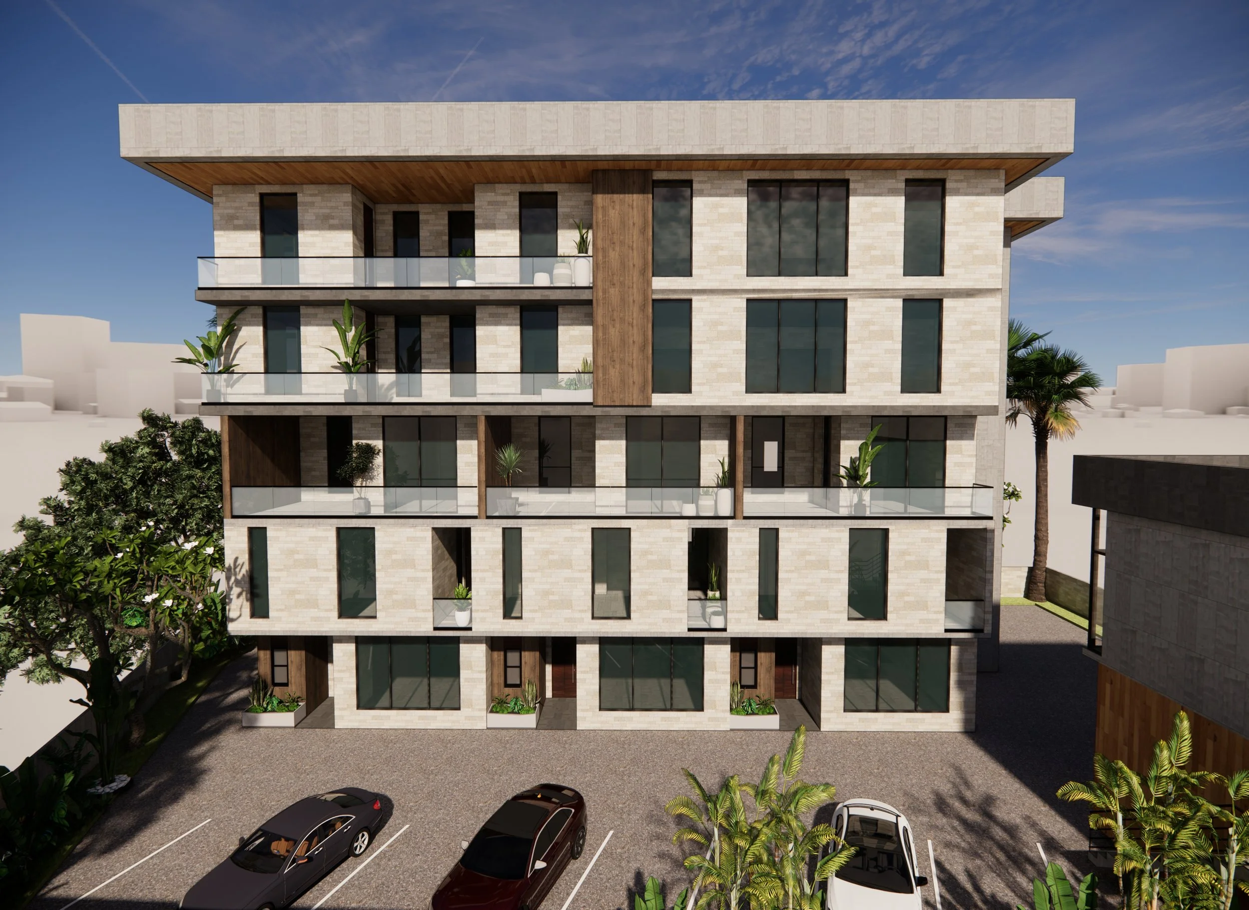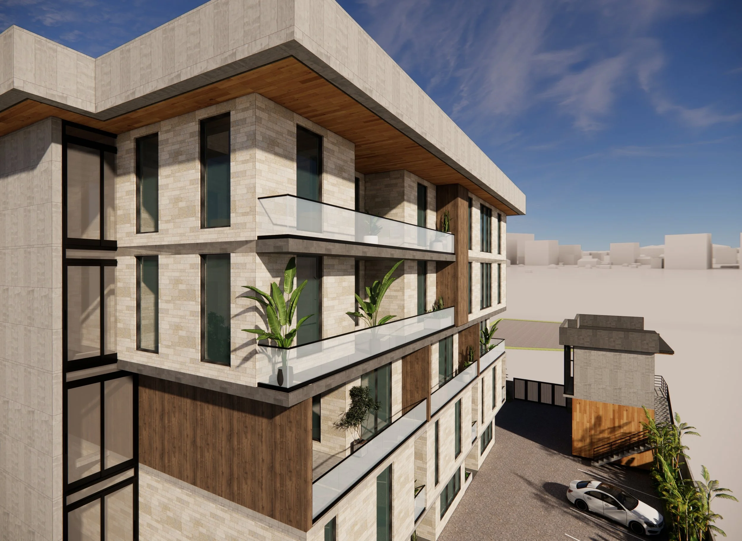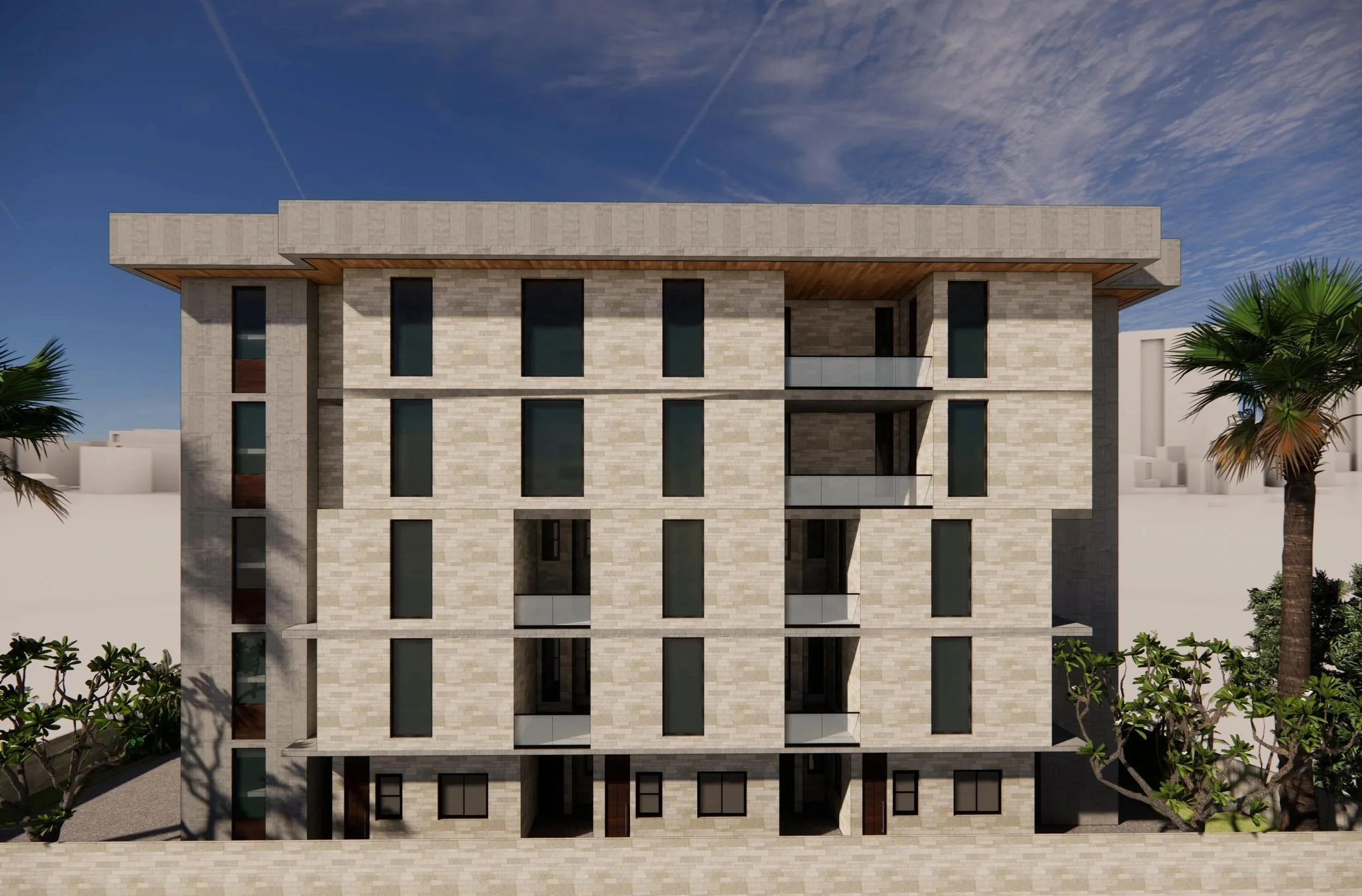 This five-level residential development reinterprets urban living through a refined blend of materiality, structure, and comfort. Designed as a unique typology, the building comprises three semi-detached terrace apartments and two exclusive penthouses crowning the uppermost level, each with private elevator access and independent entrances for added privacy and exclusivity.